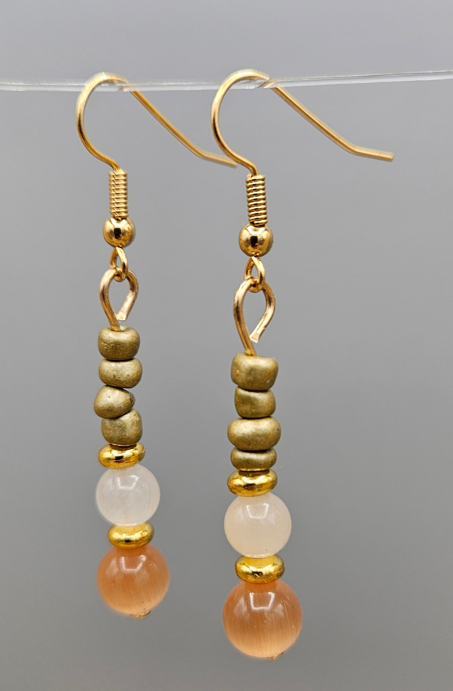Perle en verre blanc, perle œil de chat orangée, rocaille synthétique dorée et crochets dorés de finition soignée.