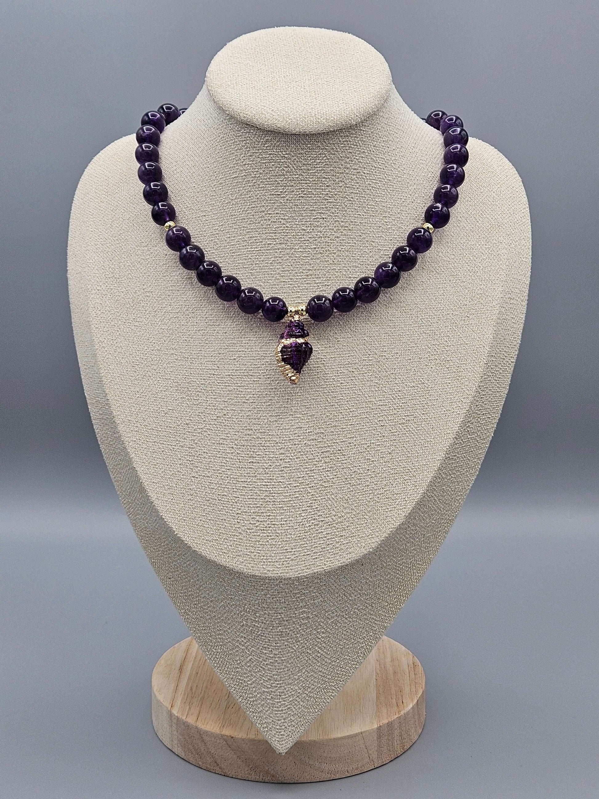 Chaque perle d’améthyste, ronde et régulière, diffuse un violet apaisant ; les petites perles en métal doré rythment l’ensemble, apportant contraste et sophistication. Le pendentif coquillage, finement travaillé, expose ses textures naturelles comme un trésor délicatement poli par l’eau. Monté sur câble pour une tenue impeccable, ce collier unit la sobriété minérale à une finesse ensoleillée, pour accompagner aussi bien une chemise blanche qu’une robe de soirée.