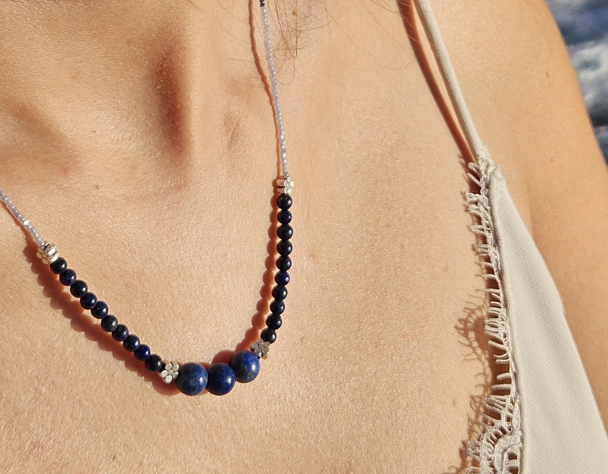 Composé de perles de lapis-lazuli et de perles Miyuki en dégradés de bleu, ce collier est fermé par un fermoir argenté discret qui signe une finition soignée et durable. Une création pensée pour la femme qui aime les bijoux fantaisie raffinés et intemporels, faits main avec une attention sincère aux détails.