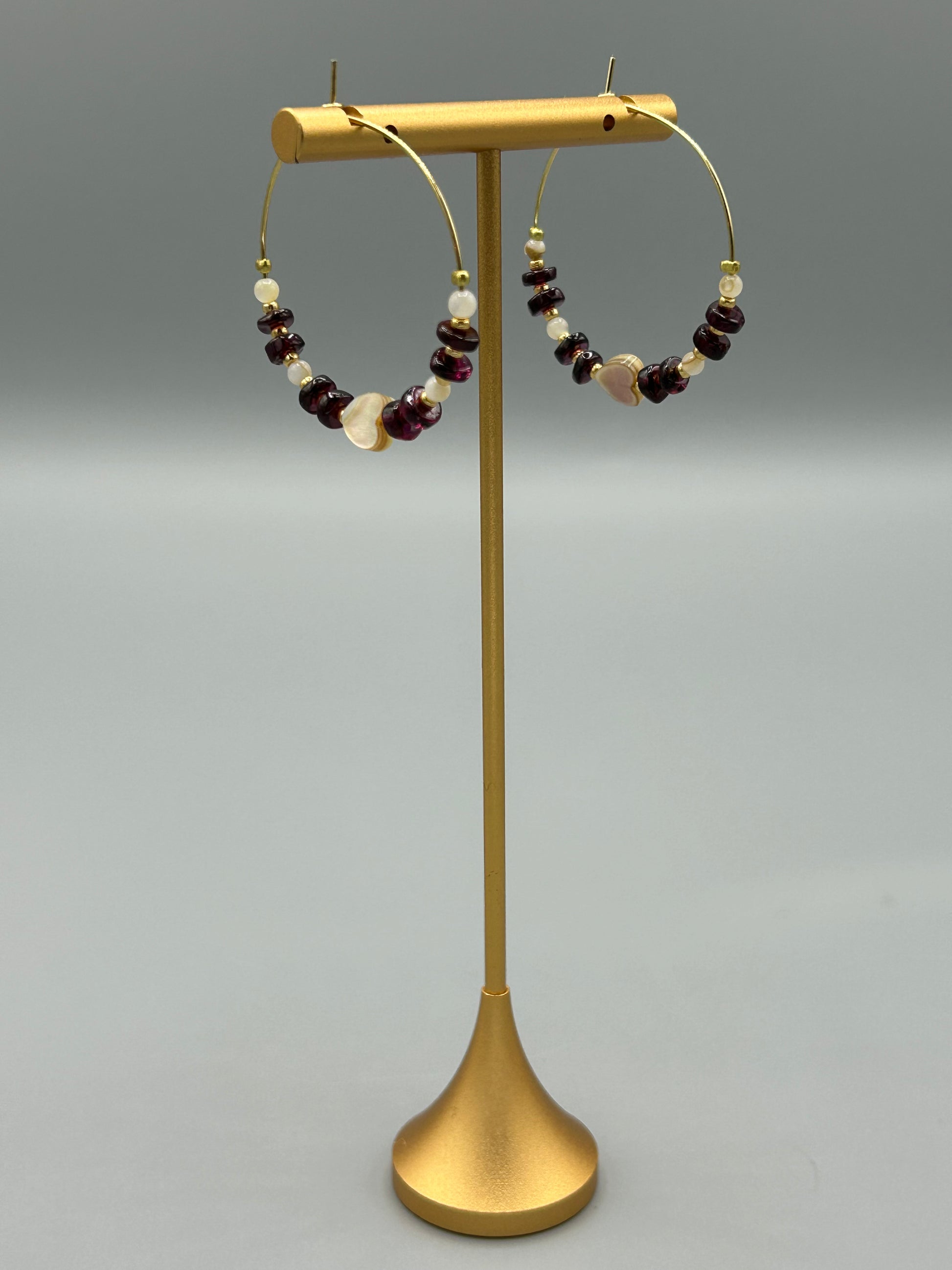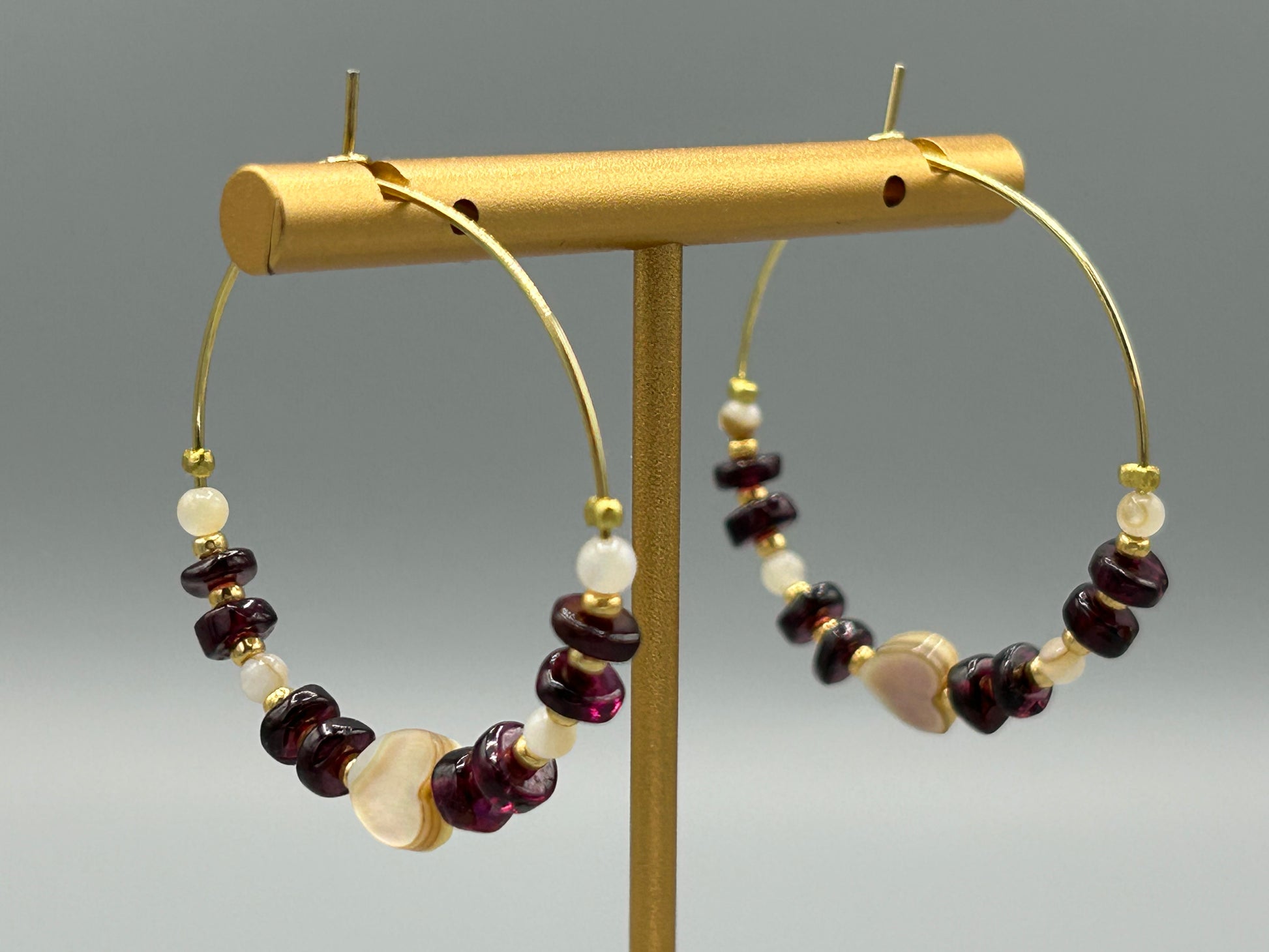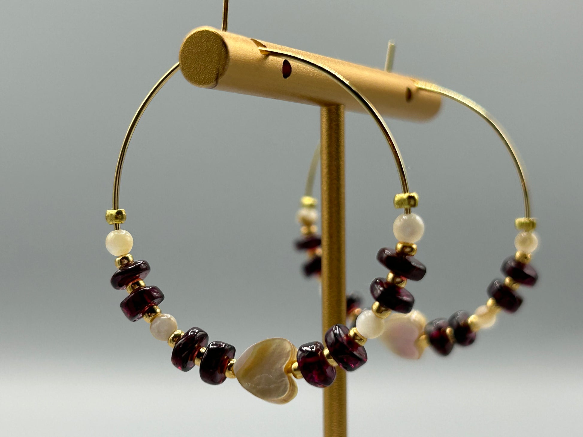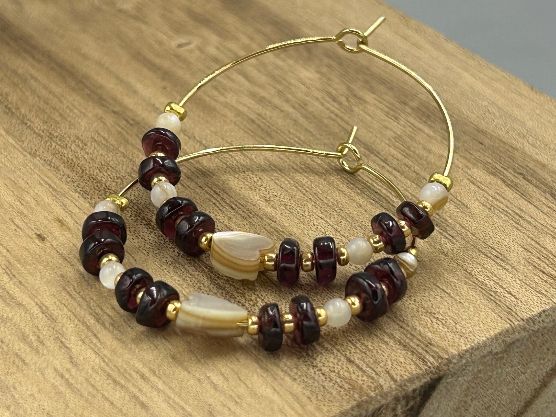 Boucles d’oreilles créoles en acier inoxydable chirurgical doré. Diamètre de la créole 35 mm, hauteur totale environ 40 mm. Composition en perles de grenat, perles de coquillage, petites perles de verre dorées et cœur central en coquillage. Montage sur créole rigide offrant une belle tenue et un rendu élégant, adapté au quotidien comme aux occasions spéciales.