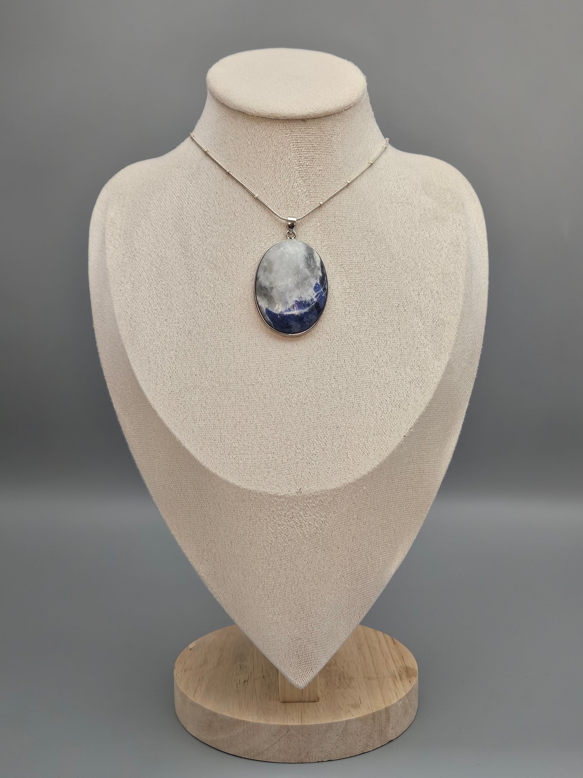 Laissez-vous séduire par ce pendentif cabochon en sodalite naturelle, une pierre au bleu profond parcouru de veines blanches et grises, évoquant un ciel nuageux ou une nuit étoilée.